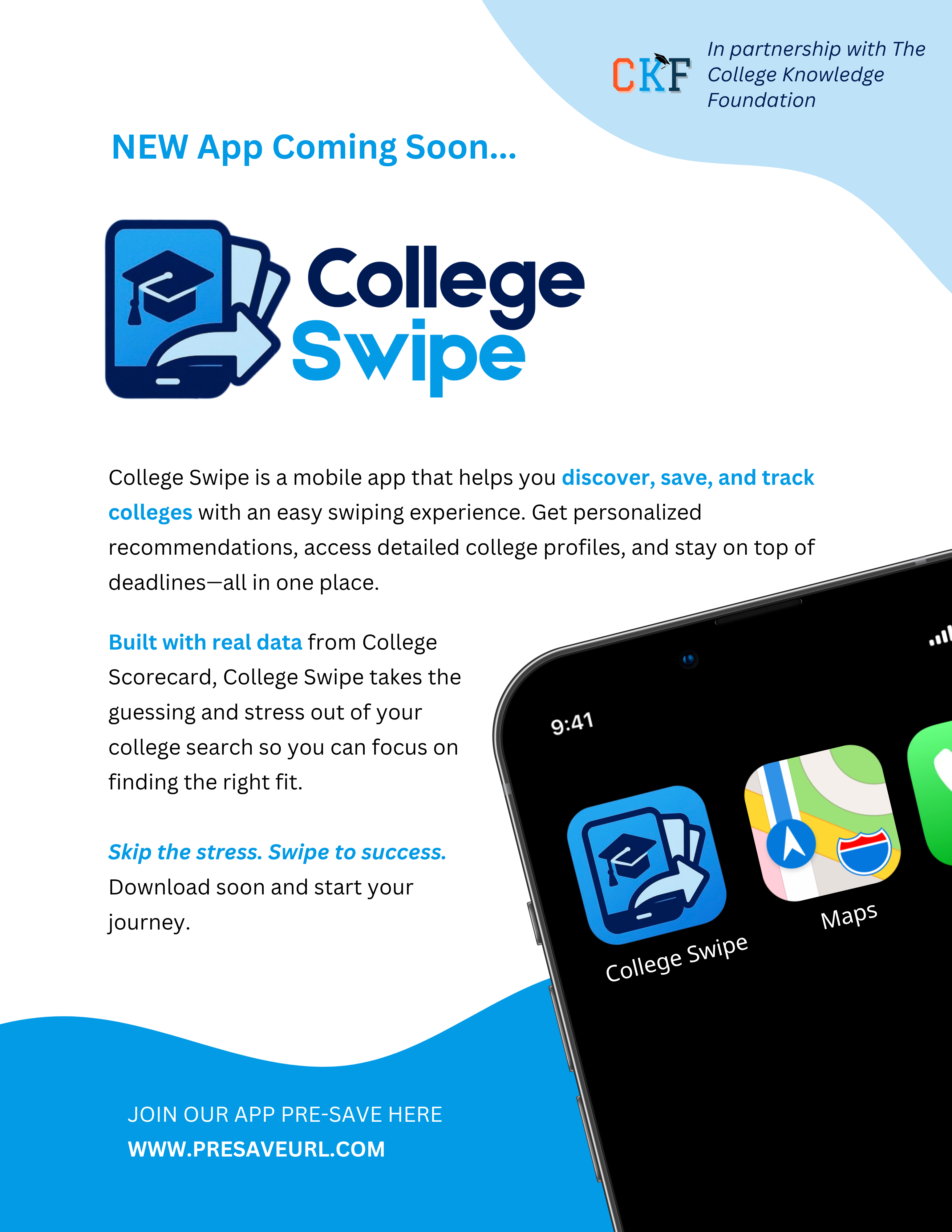 The wave elements and mobile mockup convey motion and accessibility, reinforcing the “swipe” theme of the app.