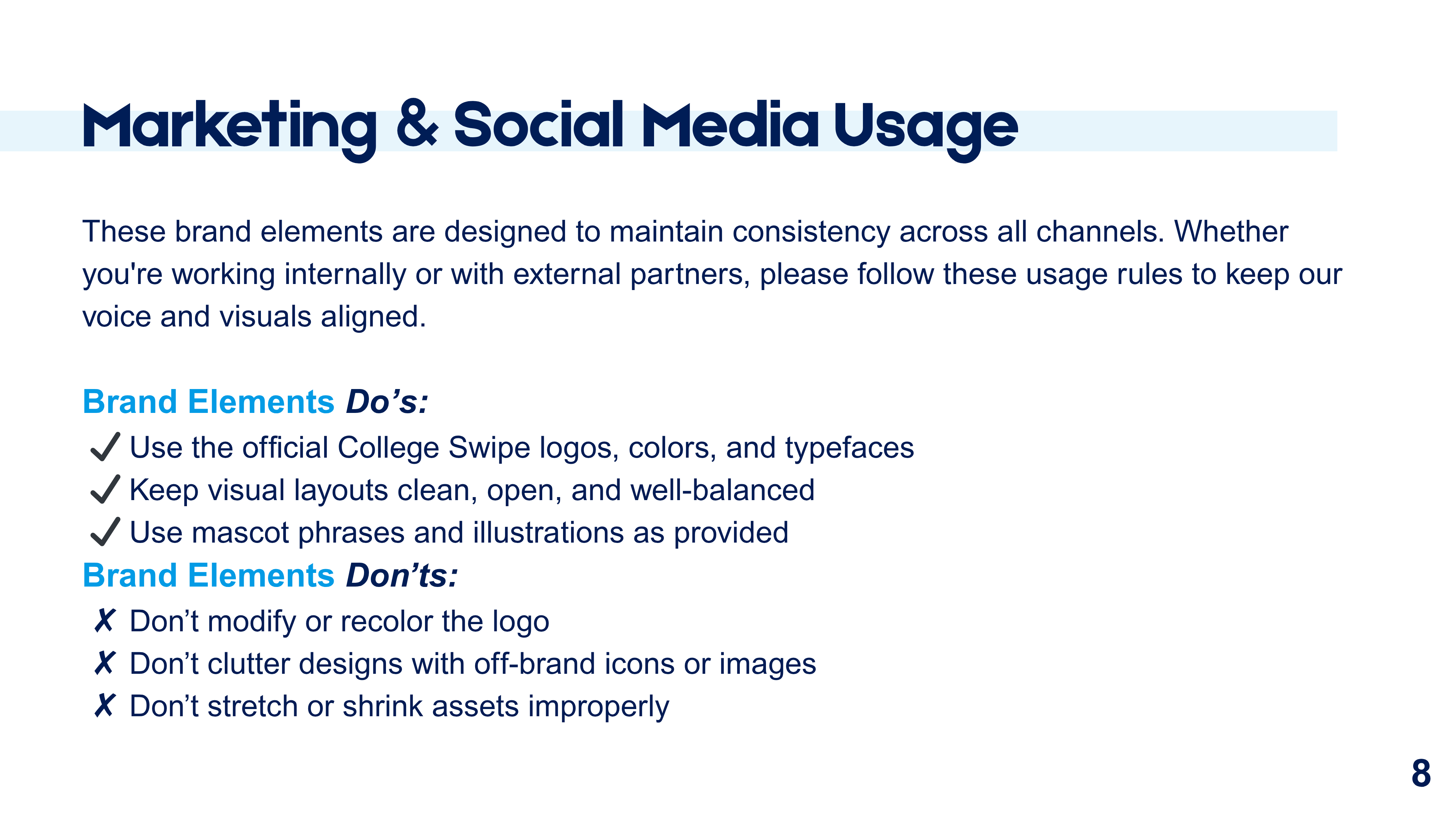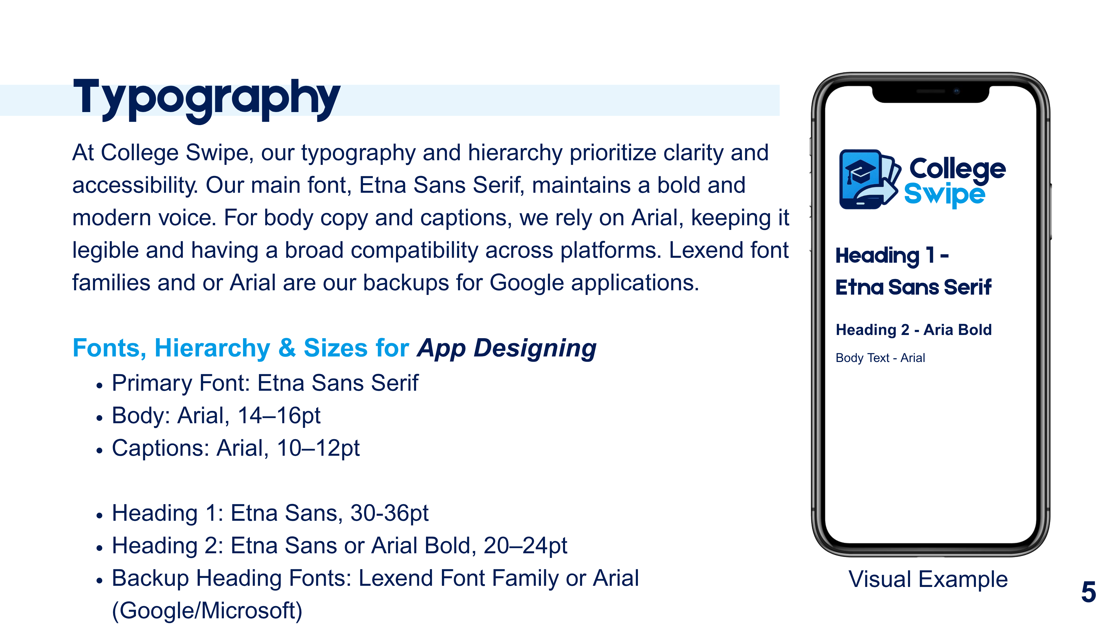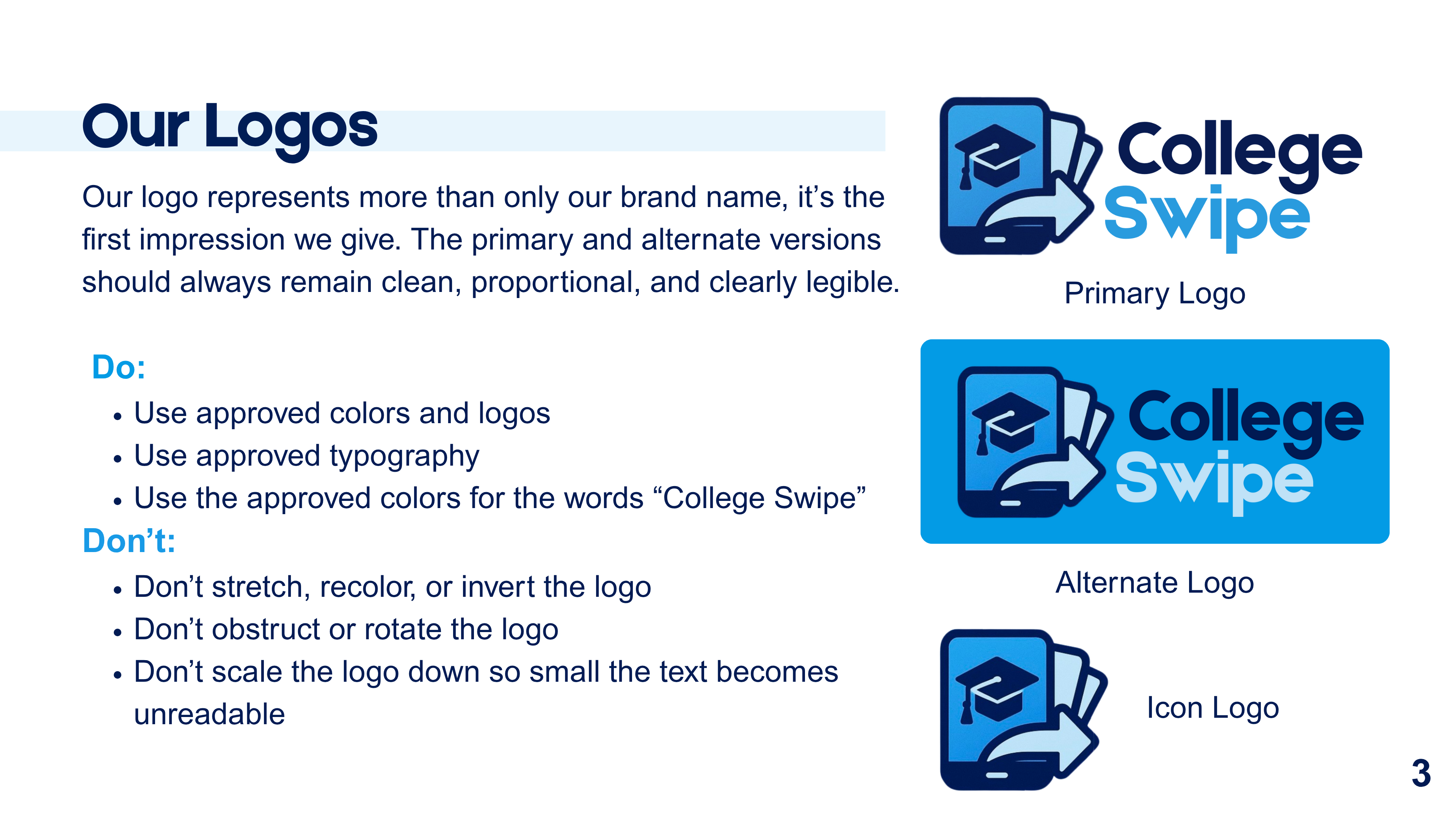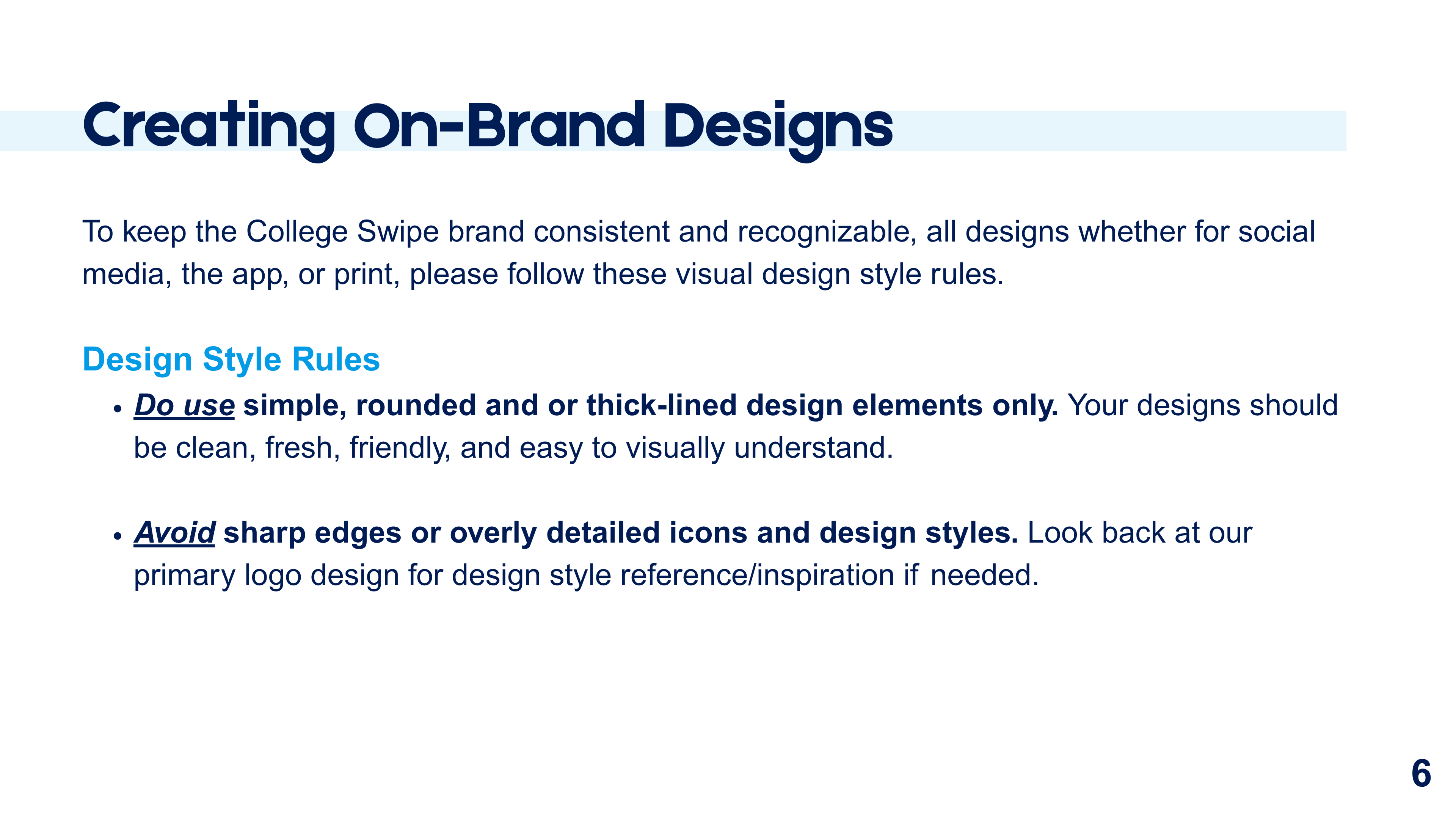 I created a clean, modern identity system that reflects the app’s clarity, trustworthiness, and youth-centered mission. The guide outlines logo usage, color palette, typography hierarchy, and on-brand design principles. Each section was built to give designers and partners clear direction for maintaining the College Swipe look and feel across all platforms.