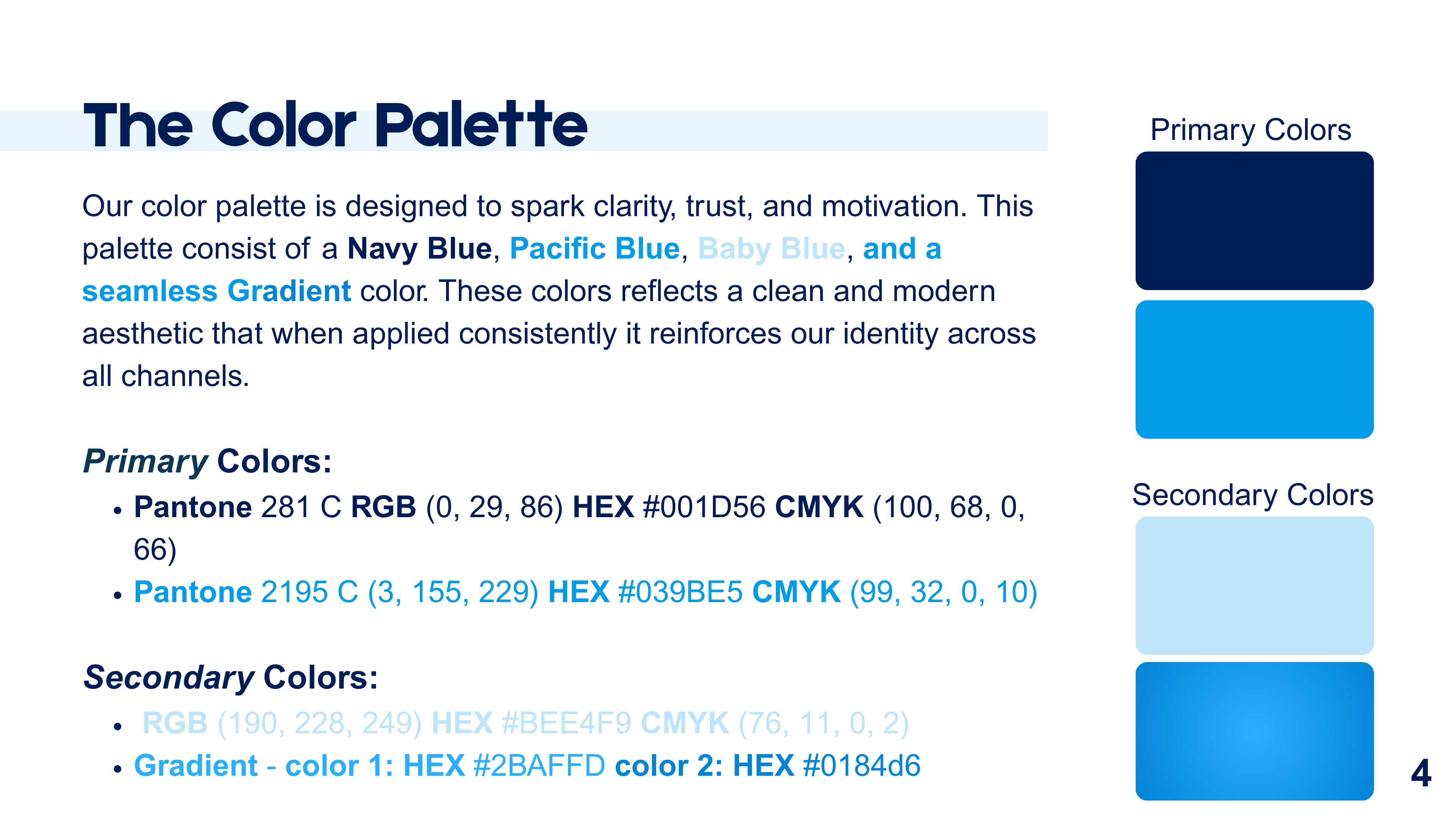 Color Palette: A combination of navy blue for professionalism and lighter blue for friendliness and approachability. This dual-tone approach enhances visual hierarchy and brand recognition.